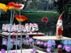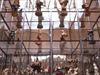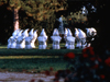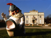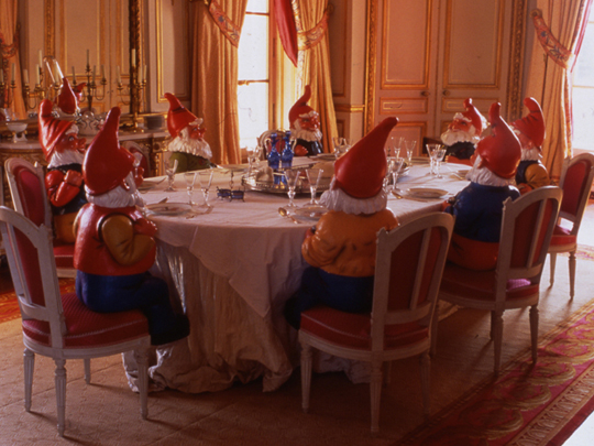 […] Ils sont partout et vont par couple ou par groupe. formant des gammes. Et quand le artistes les font, Eros, baigneurs, philosophes , Narcisse, guerriers ou jeunes mariés, loin de faire rupture, ils ne font que prolonger l’inépuisable. Les nains s’immiscent partout, dans tous  les sites, toutes les situations voire toutes les perversions, c’est donc tout naturellement qu’il devaient investir le plus chic des jardins de l’ouest parisien, Bagatelle, et déjeuner allègrement dans la salle à manger du compte d’Artois, esquisser quelques figures imposées dans son salon, ou se montrer gigantesque et provoquant au balcon sous la devise gravée du fronton « Parva sed Apta »(latin, que l’on peut traduire pour la circonstance par « petit mais adapté ) détournant à leur profit la fausse humilité de Monsieur le Compte. Dans la rotonde salon de musique, le nain de Boboli, marbre emblématique du 18éme, débat avec ses petits successeurs industriels de plastique blanc. Dans le Trianon, une monumentale étagère créée pour l’occasion, tente la classification de près de 500 pièces uniques ou industrielles. Un miroir en fond d’étagère démultiplie la condition du nain de jardin, captif de la série industrielle et brouille l’histoire. […]