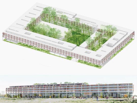 Création d'un lieu singulier En préalable à toute autre chose, le projet s'attache à créer un lieu singulier, une atmosphère, créer un existant, pour donner l'envie de s'y installer. Si un paysage existe, il n’y a rien à faire, si ce n’est se glisser délicatement dedans. S’il n’est pas là, il faut l’inventer, ajouter avec finesse ce qui change le regard et crée l’extraordinaire. Sur ce plateau de Saclay, vide et plat, sans horizon, sans point d'attache, ce lieu sera une forêt. 1 ha en pleine terre, planté d'emblée avec de très grands arbres, comme si la forêt était déjà là, quand l'ENS viendra s'installer. Elle emprunte une identité à l'histoire du site, à sa géographie antérieure et la forêt qui l'occupait. Forêt artificielle, à l’apparence naturelle, tout comme la forêt de Palaiseau, proche, plantée en 1976. Elle offrira un cadre de travail extraordinaire, influera sur le climat naturel et sur la création d’un milieu écologique. En hauteur, au niveau de la canopée, un jardin de roses, en filigrane, cerne le bâtiment. Les rosiers ramènent un morceau de Cachan, le charme des petits jardins des pavillons autour de l'Ecole et de ses massifs de fleurs, comme une accumulation légère et joyeuse des histoires plutôt qu‘une rupture.