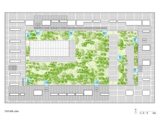 Création d'un lieu singulier En préalable à toute autre chose, le projet s'attache à créer un lieu singulier, une atmosphère, créer un existant, pour donner l'envie de s'y installer. Si un paysage existe, il n’y a rien à faire, si ce n’est se glisser délicatement dedans. S’il n’est pas là, il faut l’inventer, ajouter avec finesse ce qui change le regard et crée l’extraordinaire. Sur ce plateau de Saclay, vide et plat, sans horizon, sans point d'attache, ce lieu sera une forêt. 1 ha en pleine terre, planté d'emblée avec de très grands arbres, comme si la forêt était déjà là, quand l'ENS viendra s'installer. Elle emprunte une identité à l'histoire du site, à sa géographie antérieure et la forêt qui l'occupait. Forêt artificielle, à l’apparence naturelle, tout comme la forêt de Palaiseau, proche, plantée en 1976. Elle offrira un cadre de travail extraordinaire, influera sur le climat naturel et sur la création d’un milieu écologique. En hauteur, au niveau de la canopée, un jardin de roses, en filigrane, cerne le bâtiment. Les rosiers ramènent un morceau de Cachan, le charme des petits jardins des pavillons autour de l'Ecole et de ses massifs de fleurs, comme une accumulation légère et joyeuse des histoires plutôt qu‘une rupture.