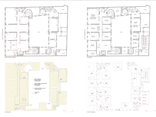 Travaux préparatoires Le plateau est libéré des revêtements de sol vétustes, des parois ajoutées, des excroissances, des plafonds de fibre et des luminaires fluorescents, pour ne conserver que l’organisation minimale de ses structures et de ses articulations autour des quatre escaliers qui le desservent.