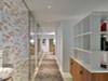 Sérigraphie des cloisonnements et portes vitrées La sérigraphie traduit le dessin original d’un motif qui s’organise à la façon d’une toile de Jouy pour se répéter infiniment sur les parois et portes de verre.