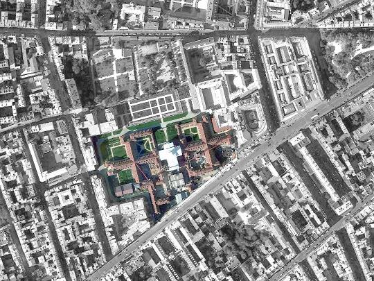 Vue aérienne du site en travaux, Accès Rue de Sèvre et Rue Vaneau, PARIS 7ème arr. |