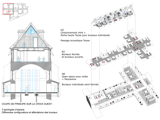 Aménagement des bureaux, Coupe sur les 3 niveaux Croix Ouest |