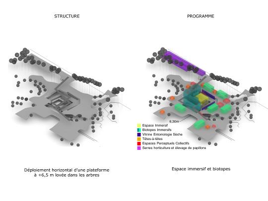 Le projet part d’une situation existante : un bâtiment et un espace extérieur aménagé. L’enveloppe externe dégradée est déposée, sa structure et les trois planchers sont conservés : sous-sol à -4,00m, rez-de-jardin et un plancher à +4,57m. Autour de ces trois planchers, desservie par un système de rampes, s’ajoute une vaste plateforme à 6,50m, extraordinaire extension, qui se love précisément et délicatement dans les arbres du Jardin sans impacter les plantations, les sols et les équipements. Les rampes s'élèvent dans l'espace immersif central, enrichi de 9 biotopes spécifiques. Elles l'entourent, le traversent, l'explorent dans la hauteur, d'un niveau à l'autre, pour être toujours au plus près des insectes… jusqu'à la prairie canadienne, sur le toit, à plus de 12 m au-dessus du sol. Le projet propose alors la mise en place d’un dispositif capable et évolutif qui permet de créer une multitude de situations extraordinaires et contrastées en rapport à la géographie du jardin botanique et en réponse à l’ambition des équipes de l’insectarium et au programme initial.