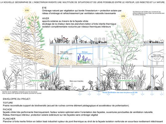 Le projet part d’une situation existante : un bâtiment et un espace extérieur aménagé. L’enveloppe externe dégradée est déposée, sa structure et les trois planchers sont conservés : sous-sol à -4,00m, rez-de-jardin et un plancher à +4,57m. Autour de ces trois planchers, desservie par un système de rampes, s’ajoute une vaste plateforme à 6,50m, extraordinaire extension, qui se love précisément et délicatement dans les arbres du Jardin sans impacter les plantations, les sols et les équipements. Les rampes s'élèvent dans l'espace immersif central, enrichi de 9 biotopes spécifiques. Elles l'entourent, le traversent, l'explorent dans la hauteur, d'un niveau à l'autre, pour être toujours au plus près des insectes… jusqu'à la prairie canadienne, sur le toit, à plus de 12 m au-dessus du sol. Le projet propose alors la mise en place d’un dispositif capable et évolutif qui permet de créer une multitude de situations extraordinaires et contrastées en rapport à la géographie du jardin botanique et en réponse à l’ambition des équipes de l’insectarium et au programme initial.