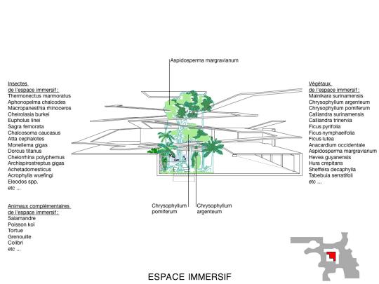 L’expérience immersive: Dès l’entrée le visiteur est plongé dans une image « piranésienne » faite de multiples points de perspective et de lumières, de multiples cheminements possibles d’ascendance étonnante. Cet ensemble d’architecture est plongé dans l’abondance végétale, les mouvements perpétuels et colorés des papillons et colibris, baignés par des faisceaux de lumière zénithale, le son d’une cascade, le bruissement des feuilles généré par le souffle d’un courant d’air. Ce tableau vivant se développe sur plus de 16m de haut depuis le niveau –4m jusqu’à la lumière de la toiture jardin.