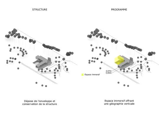 Le projet part d’une situation existante : un bâtiment et un espace extérieur aménagé. L’enveloppe externe dégradée est déposée, sa structure et les trois planchers sont conservés : sous-sol à -4,00m, rez-de-jardin et un plancher à +4,57m. Autour de ces trois planchers, desservie par un système de rampes, s’ajoute une vaste plateforme à 6,50m, extraordinaire extension, qui se love précisément et délicatement dans les arbres du Jardin sans impacter les plantations, les sols et les équipements. Les rampes s'élèvent dans l'espace immersif central, enrichi de 9 biotopes spécifiques. Elles l'entourent, le traversent, l'explorent dans la hauteur, d'un niveau à l'autre, pour être toujours au plus près des insectes… jusqu'à la prairie canadienne, sur le toit, à plus de 12 m au-dessus du sol. Le projet propose alors la mise en place d’un dispositif capable et évolutif qui permet de créer une multitude de situations extraordinaires et contrastées en rapport à la géographie du jardin botanique et en réponse à l’ambition des équipes de l’insectarium et au programme initial.