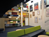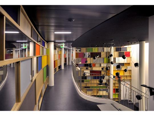 Coursive Niveau 0 du Foyer des musiciens / Vue sur le Niveau –1: Le « meuble/mur acoustique » enveloppe la double hauteur |