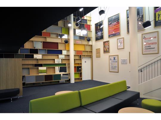 Niveau –1 du Foyer des Musiciens: « meuble/mur acoustique » sur la double hauteur et salons de détente |