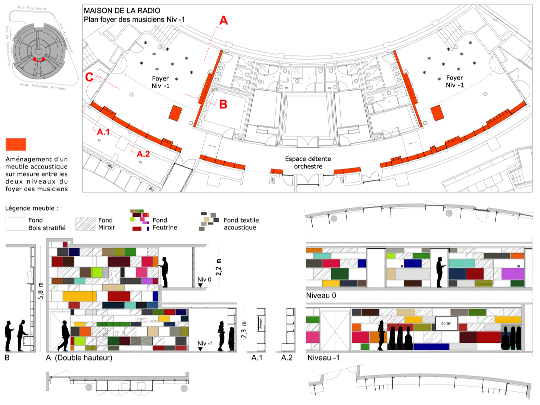 Plans et coupes Niveau 0 et Niveau –1 du « meuble/mur acoustique » dans le Foyer des Musiciens |
