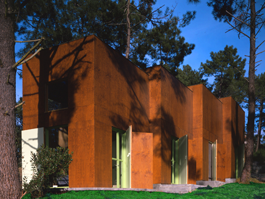 La maison Navarro est une maison de vacances située dans le lotissement des vallons du Ferret au Canon. Cette maison est emblématique des projets réalisés au sein de l’agence Epinard Bleu, désignation de la première agence d’architecture de Frédéric Druot. La maison, entièrement construite en bois, s’organise à partir de l’assemblage de quatre volumes de 4,8m x 3,6m x ht 6m, décalés les uns par rapport aux autres de 45cm horizontalement et verticalement. Le glissement des volumes permet une multiplication des variations de dimensions des pièces intérieures. La particularité de cette maison est d’être totalement fermée lorsqu’elle est inoccupée. Son coût de construction très faible est du à la simplicité et à la préfabrication de ses volumes et charpentes. |