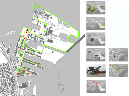 Il s’agit d’être attentif à toutes les situations existant sur le territoire, de préserver toute la capacité du site et des bâtiments, d’imaginer pour chaque cas de devenir par une transformation simple, un lieu exceptionnel, de faire évoluer l’ensemble vers la domesticité et le plaisir. Faire l’inventaire précis des situations variées et remarquables, les exagérer, les additionner, les métamorphoser pour créer des situations urbaines remarquables, multiples et douces, fluides et pratiques. Sur cette friche portuaire de 270ha, des activités et des constructions variées existent, des voiries organisent déjà des liaisons commodes. Il s’agit de profiter de cette non-conformité des assemblages urbains, de la lumière exceptionnelle du paysage, comme préalable urbain à la ville durable. Pour les futurs 80000 citoyens dont 40000 habitants, il s’agit de limiter les parcours, de limiter les réseaux, de limiter les dépenses d’énergie, de densifier les services et les facilités. Il s’agit de répondre à la question du logement et des lieux de travail en offrant à chaque situation le bénéfice de surfaces et de vues exceptionnelles sur la baie, la mer et le ciel.