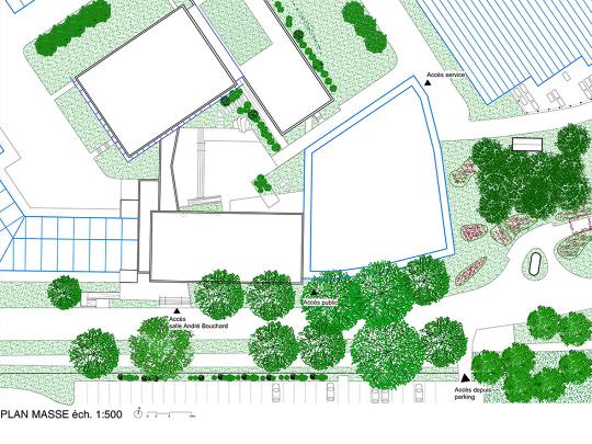 Le projet s’attache à répondre de manière simple et pragmatique aux désirs formulés dans le programme pour la création d’une salle multifonctionnelle, de forte capacité et très flexible. La salle multifonctionnelle, son hall et ses annexes occupent la totalité de la surface du terrain imparti. Le niveau du plancher et la hauteur libre sous poutre sont strictement identiques à ceux de la salle André Bouchard afin de faciliter la mutualisation et la continuité des deux espaces en termes d’usage et de manutention. L’espace en rez-de-jardin est ample, libre, dégagé de toute structure. La majorité des espaces de soutien et de stockage sont positionnés en étage ou au sous-sol afin de libérer l’espace au rez-de-jardin et dégager les vues vers l’extérieur. L’intérieur laisse percevoir les variations climatiques cycliques, saisonnières et journalières des conditions lumineuses et thermiques extérieures. Le soir, le Pavillon de verre est visible et lumineux depuis le jardin.