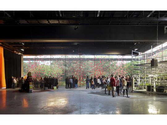 Le projet s’attache à répondre de manière simple et pragmatique aux désirs formulés dans le programme pour la création d’une salle multifonctionnelle, de forte capacité et très flexible. La salle multifonctionnelle, son hall et ses annexes occupent la totalité de la surface du terrain imparti. Le niveau du plancher et la hauteur libre sous poutre sont strictement identiques à ceux de la salle André Bouchard afin de faciliter la mutualisation et la continuité des deux espaces en termes d’usage et de manutention. L’espace en rez-de-jardin est ample, libre, dégagé de toute structure. La majorité des espaces de soutien et de stockage sont positionnés en étage ou au sous-sol afin de libérer l’espace au rez-de-jardin et dégager les vues vers l’extérieur. L’intérieur laisse percevoir les variations climatiques cycliques, saisonnières et journalières des conditions lumineuses et thermiques extérieures. Le soir, le Pavillon de verre est visible et lumineux depuis le jardin.