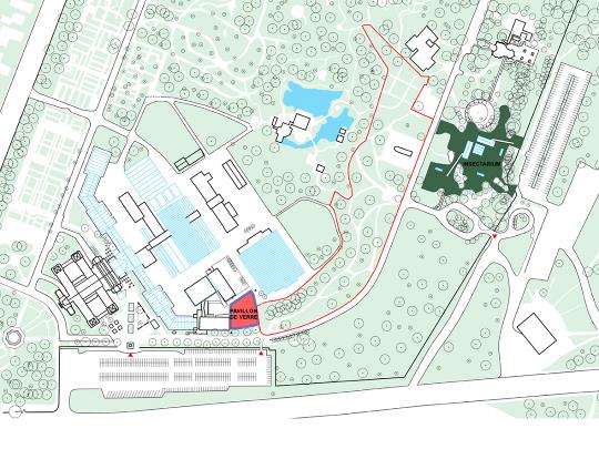 Le projet s’attache à répondre de manière simple et pragmatique aux désirs formulés dans le programme pour la création d’une salle multifonctionnelle, de forte capacité et très flexible. La salle multifonctionnelle, son hall et ses annexes occupent la totalité de la surface du terrain imparti. Le niveau du plancher et la hauteur libre sous poutre sont strictement identiques à ceux de la salle André Bouchard afin de faciliter la mutualisation et la continuité des deux espaces en termes d’usage et de manutention. L’espace en rez-de-jardin est ample, libre, dégagé de toute structure. La majorité des espaces de soutien et de stockage sont positionnés en étage ou au sous-sol afin de libérer l’espace au rez-de-jardin et dégager les vues vers l’extérieur. L’intérieur laisse percevoir les variations climatiques cycliques, saisonnières et journalières des conditions lumineuses et thermiques extérieures. Le soir, le Pavillon de verre est visible et lumineux depuis le jardin.