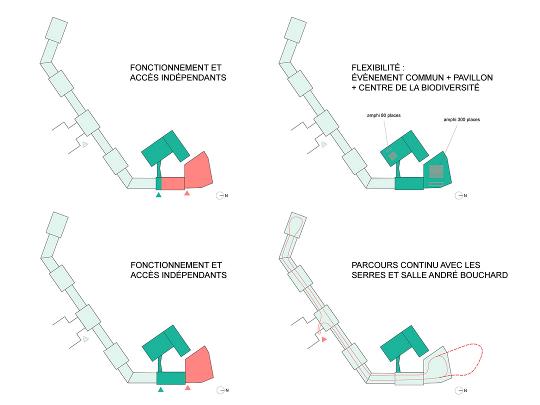 Flexibilité: diversité d’usages et associations possibles entre le Pavillon de verre, la salle Bouchard et les Serres |
