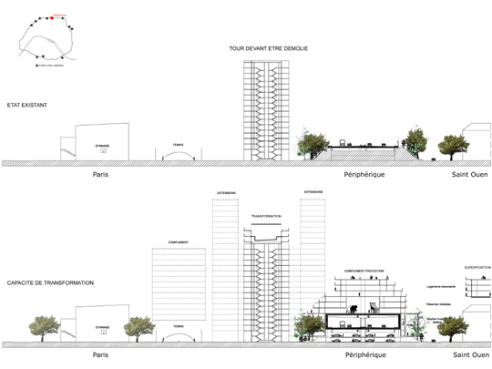 PARIS SUC, Une centaine de cas d’études sur la frange intra-muros du périphérique parisien > Cas présenté Secteur Poissonniers > Tour existante de logements >> Transformation Extensions neuves : + 2 900 m² |