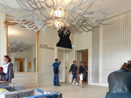Aile des Ministres Sud:  Un des salons en enfilades qui accueillent la file d’attente des visiteurs. Silhouette: Anne d’Autriche. Mobiliers: « Confidents ». Papiers peints: Couronnes déclinées