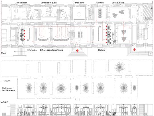 Le projet concerne la transformation des ailes des Ministres Nord et Sud du Château de Versailles en espaces d’accueil des visiteurs. Publics individuels dans l’aile Sud, accueil des groupes « visites conférences » et des groupes scolaires dans l’aile Nord. Restitution des enfilades de salons, dégagement des accès et  simplification des flux, bénéfice des lumières de la cour d’honneur, créations originales de mobiliers et de lustres, pigmentation des espaces de silhouettes de rois et reines, de papiers peints aux monogrammes royaux et aux symboles républicains, réveillent joyeusement l’histoire de ces lieux emblématiques. Mobiliers et lustres originaux livrent une interprétation contemporaine  des ordonnancements classiques. « Banquettes », « Confidents »,  Boudeuses », « Indiscrets » guident  l’organisation des flux et offrent au public le plus grand confort dans les enfilades des salons aux plafonds ponctués par des lustres aux dimensions exceptionnelles. Dans chaque espace, dans chaque salon, l’interprétation des signes de l’histoire de Versailles.