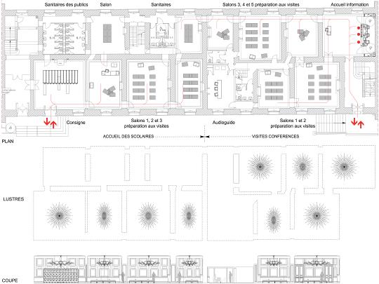 Le projet concerne la transformation des ailes des Ministres Nord et Sud du Château de Versailles en espaces d’accueil des visiteurs. Publics individuels dans l’aile Sud, accueil des groupes « visites conférences » et des groupes scolaires dans l’aile Nord. Restitution des enfilades de salons, dégagement des accès et  simplification des flux, bénéfice des lumières de la cour d’honneur, créations originales de mobiliers et de lustres, pigmentation des espaces de silhouettes de rois et reines, de papiers peints aux monogrammes royaux et aux symboles républicains, réveillent joyeusement l’histoire de ces lieux emblématiques. Mobiliers et lustres originaux livrent une interprétation contemporaine  des ordonnancements classiques. « Banquettes », « Confidents »,  Boudeuses », « Indiscrets » guident  l’organisation des flux et offrent au public le plus grand confort dans les enfilades des salons aux plafonds ponctués par des lustres aux dimensions exceptionnelles. Dans chaque espace, dans chaque salon, l’interprétation des signes de l’histoire de Versailles.
