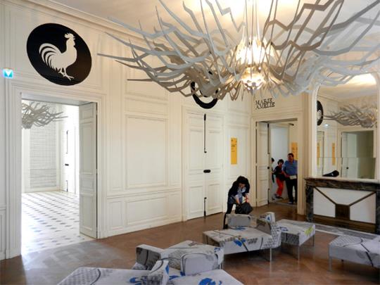 Aile des Ministres Sud: salon d’attente à la sortie de la billetterie. Silhouettes: Cocarde et coq. Mobilier: « indiscret »